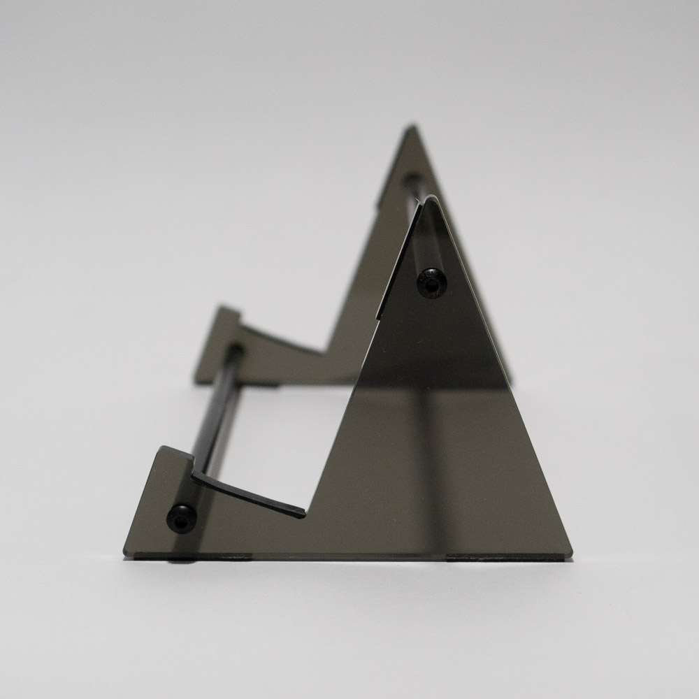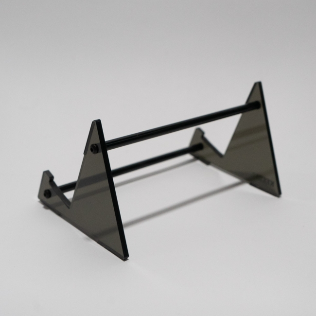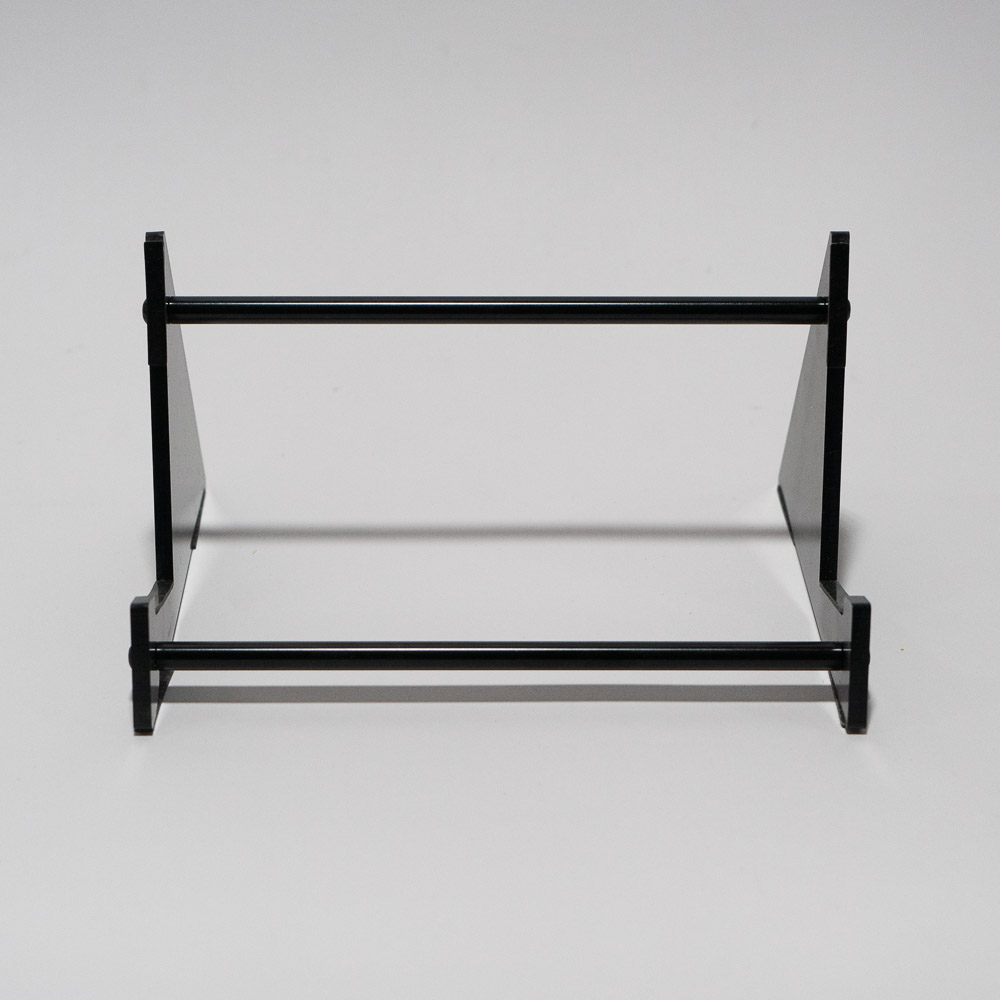 This minimalist display stand features a sturdy acrylic and metal construction with a geometric, industrial design that keeps the focus on what you’re presenting. The angled side supports and dual horizontal rods provide stable, balanced support, making it ideal for displaying items such keyboards, books, tablets, artwork, prints, or small merchandise.